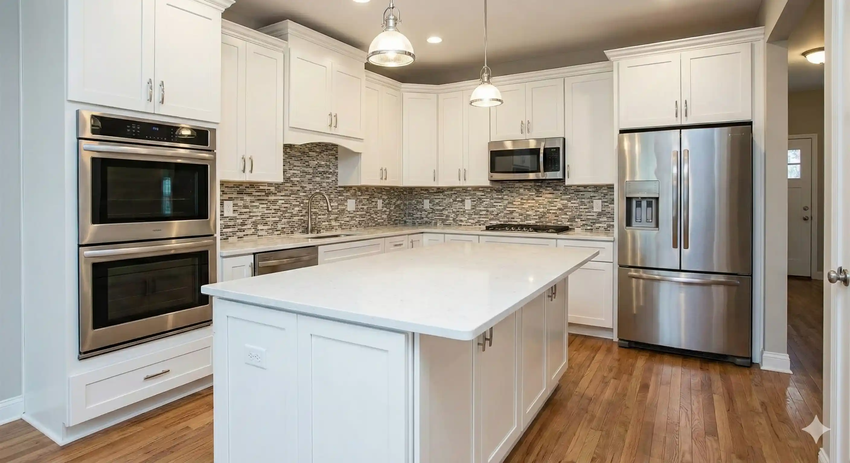 Cocina moderna con isla central, nuevos muebles, puntos de luz y electrodomésticos integrados.